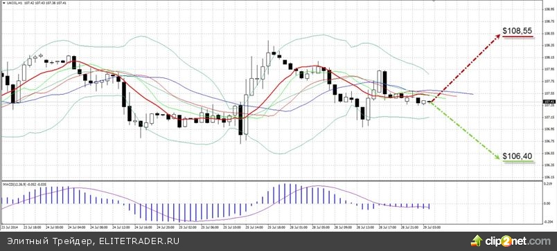Торговля в понедельник нефтяными фьючерсами Brent подкрепила мнение об превышении предложения над слабым спросом на рынке. Начав торги с $108,11 за баррель, нефть опустилась ниже $108,00 отметки и продолжила торговаться в районе $107,50, завершив торги на отметке $107,48. Геополитическая напряженность в Украине, Ираке, Ливии и секторе Газа оказывает поддержку цене на нефть, но отсутствие роста связано с избыточным предложением на рынках североморской и западноафриканской нефти. Поэтому вряд ли в ближайшее время следует ожидать изменения в динамике цены, так как инвесторы сомневаются, что принятие санкций против РФ существенно повлияет на предложение нефти. Полосы Боллинджера показывают среднюю волатильность цены на Brent на ближайших торгах, при этом скользящие средние индикатора Alligator в очередной раз пересеклись и подтверждают консолидацию цены. В среду будут опубликованы данные по ВВП США за второй квартал, которые отразят состояние экономики крупнейшего в мире потребителя нефти.