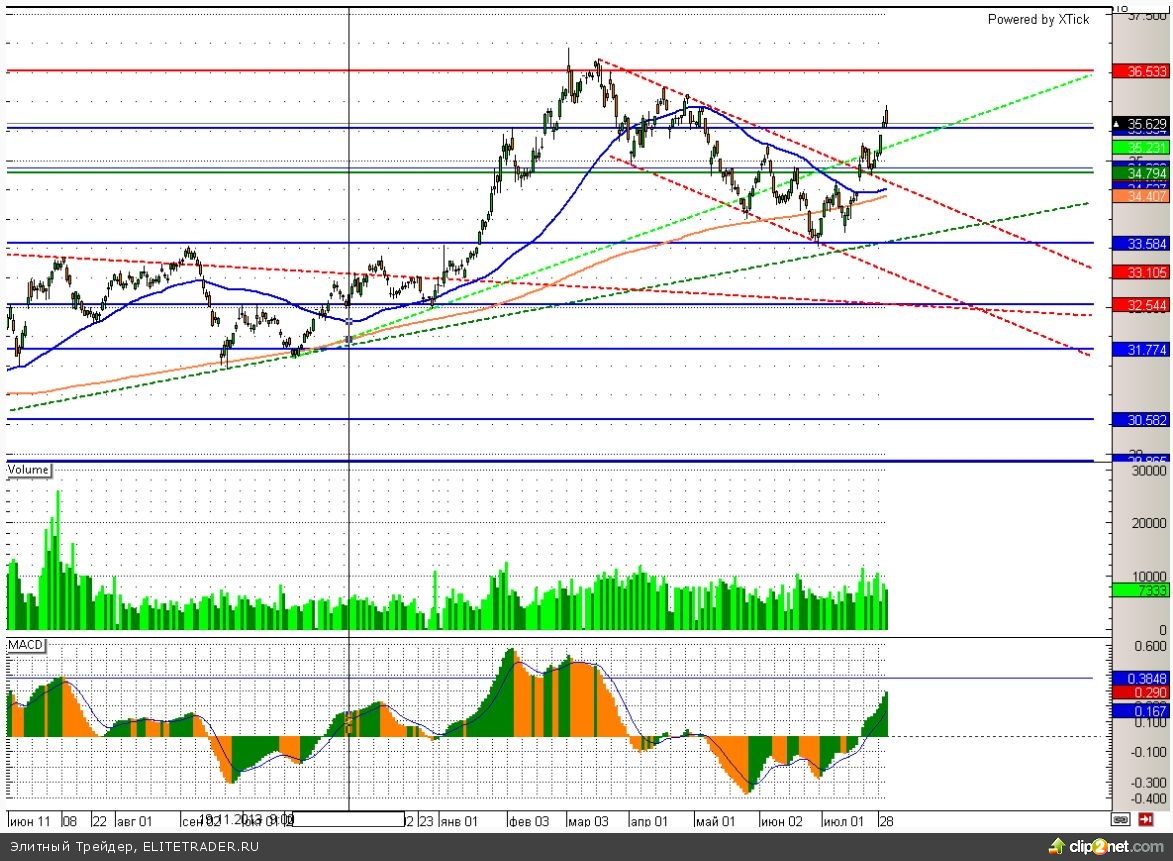 Данные меры в среднесрочной перспективе еще крайне негативно скажутся на российской экономике, но пока участники расценили это как повод совершить небольшую коррекцию в паре доллар/рубль. В свою очередь дополнительным позитивом являются по-прежнему высокие цены на нефть, которые консолидируются выше 107,5 долларов за баррель по сорту Brent, а также уплата налога на добычу полезных ископаемых российскими эспортерами. При этом не стоит забывать и про долгосрочный позитивный эффект для рубля от повышения ключевой ставки Банком России на заседании в пятницу. На этом фоне пара доллар/рубль успешно скорректировалась от основной цели роста в районе 36 и уже фактически добралась до первой серьезной поддержки. Поддержка эта располагается в диапазоне между 35,3-35,5 и несет в себе неплохую возможность снова купить американскую валюту.