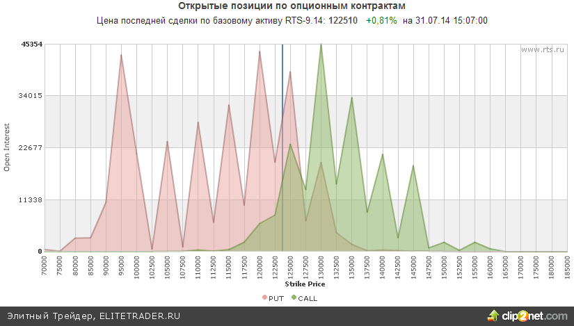 Между тем открытые опционные позиции по RIU4 со сроком исполнения 15.8.14 сейчас находятся в нейтральном положении. На отметке 120000 можно увидеть огромное количество опционов пут, которые выступают сильной поддержкой. При этом эквивалентное количества опционов колл располагается лишь в районе 130000.