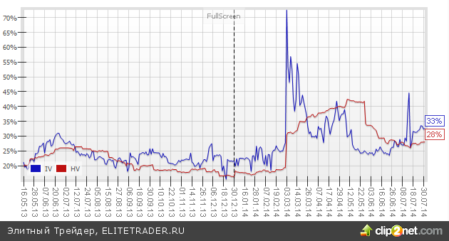 В свою очередь, подразумеваемая волатильность RIU4 находится выше исторической на целых 5 пунктов. Данный момент говорит о существенной перекупленности опционов, которая обычно сглаживается путем роста.