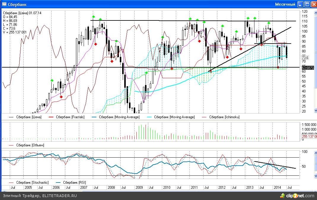 Сейчас акции торгуются на уровне медленной скользящей средней ЕМА100 по месячному графику, которая при последней просадке выступила в роли ближайшей поддержки. Выступил ли она таковой сейчас, пока сказать сложно. Более важные поддержки находятся в зоне 62-65 рублей, тест которых исключать не стоит.