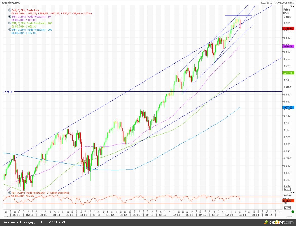 Текущая неделя прошла на минорной ноте. Вчера падение усилилось, и SnP500, наконец, вышел из июльского боковика, в котором пребывал на протяжении всего сезона отчетности. При этом был пробит восходящий тренд 2014 года, что позволяет сделать предположение о начале коррекции. Ее ждет уже даже Алан Гринспен.