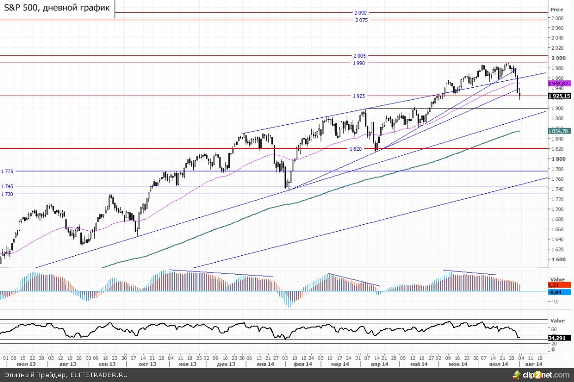 Помимо общего уже «привычного» негатива, касающегося санкций в отношении РФ, наибольшие опасения для нашего рынка акций сейчас представляет ситуация на развитых площадках. Нет никакой уверенности в том, что пятничная консолидация после мощного падения накануне в очередной раз выльется в новую волну роста. Техника по индексу широкого рынка SnP 500 очень сильно настораживает. Да, сегодня будет предпринята попытка отскока и возможно в краткосрочной перспективе котировки вернутся в район 1950-1960, однако затем распродажи, на мой взгляд, наверняка будут продолжены. Потенциальный спуск SnP 500 ниже 1900-1910 может спровоцировать мощный импульс вниз. Как мне кажется, текущий рост волатильности является признаком того, что тренд уже исчерпал себя. Вся позитивная статистика по экономике США начинает транслироваться через призму потенциального роста ставок. Глава ФРБ Далласа Р. Фишер уже высказал свое предположение о том, что процентные ставки могут быть увеличены уже в начале 2015 года, что не совпадает с общими ожиданиями большинства экспертов.
