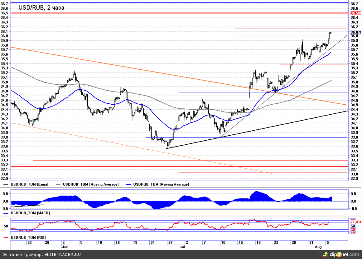 Ситуация с российским рублем продолжает развиваться по негативному сценарию. В паре usd/rub наблюдается тренд, который идет в своем классическом для этого инструмента формате. Не оправдались даже надежды на локальный коррекционный откат к 35,55. Так уж сложилось, что курс usd/rub в последние годы является очень трендовым инструментом. Если началось устойчивое движение, то в него стоит заходить, добавляя объем по пути следования. Текущее положение дел как раз лишь подтверждает эту теорию. Вчера курс преодолел 36 рублей за доллар и теперь всем очевидна ближайшая зона торможения - это область 36,5-37, где ЦБ активно «интервенил» во время мартовских событий.