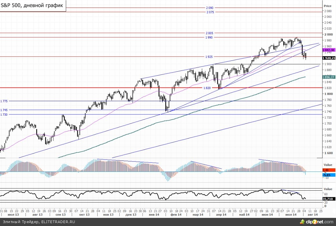 Возобновил снижение американский индекс SnP500 на торгах вторника, подтверждая коррекционный настрой после пробоя восходящего тренда 2014 года, который он протестировал снизу днем ранее. Почти процент потерял вчера индекс, при этом все 10 секторов во главе с энергетическим (-2,14%) закрылись в «красной зоне». Технически динамика на дневном таймфрейме напоминает период конца января текущего года, где после консолидации последовала новая резка волна продаж. В текущей ситуации цели снижения прослеживаются в районе 1890-1900, где проходит долгосрочный up-тренд.