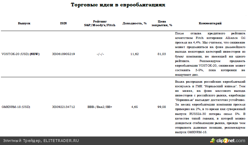 В госбумагах продолжаются продажи. По итогам торгов в среду индекс гособлигаций снизился на 0,4% до 121,9 п. Доходности эталонных выпусков растут: доходность ОФЗ 26206 подросла на 14 б. п. до 9,69% годовых, доходность ОФЗ 26207 увеличилась на 12 б. п. до 9,76%.