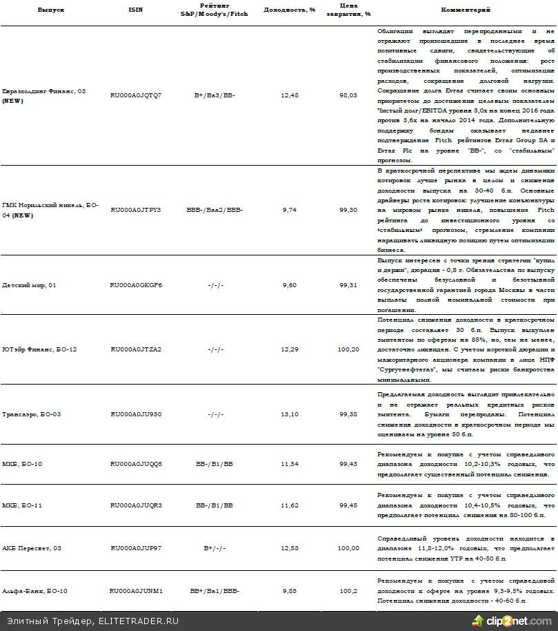 Банк широко представлен на рынке публичного долга, однако, как правило, его выпуски не отличаются высокой ликвидностью. По сути, единственным более-менее ликвидным выпуском можно признать недавно размещенный ЮниКредит, БО- 21 (дюрация 0,8, YTP – 9,90%, G-спред – 99 б. п.). Сегодня «ЮниКредит Банк» закрывает книгу заявок на покупку инвесторами выпуска ЮниКредит, БО-22 объемом 10 млрд руб. Ориентир ставки первого купона вчера был сужен до 10,30%-10,40% годовых против первоначальных 10,30-10,50% годовых, что теперь соответствует доходности к годовой оферте в диапазоне 10,57-10,67% годовых. По нашим оценкам, справедливая доходность нового выпуска составляет 10,7-10,8% годовых, что не предполагает существенной премии к вторичному рынку.
