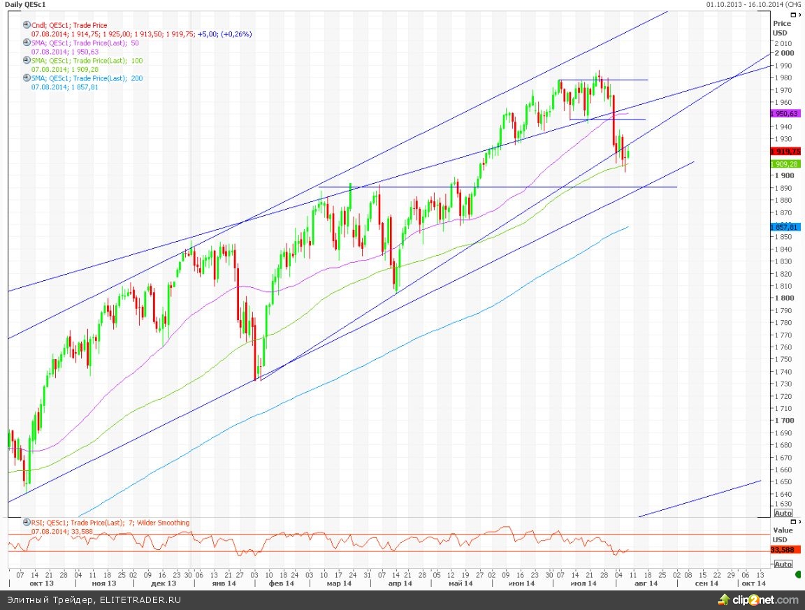 Техническая картина: на данный момент мы наблюдаем отскок от падения, который вплоть до 1945 пунктов по фьючерсу на SnP 500 (нижняя граница старого боковика) будет лишь отскоком. В ближайшей перспективе, снижение, вероятно, продолжиться. В качестве ближайшего таргета можно будет выделить уровень 1890-1885 пунктов (нижняя граница долгосрочного восходящего канала и среднесрочная горизонтальная поддержка).