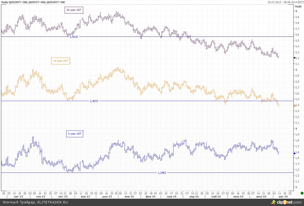 В частности мы видим, что на фоне геополитических рисков идет активная покупка защитных инструментов, то есть казначейских облигаций, в которых можно было бы пересидеть и коррекцию на рынке акций. Казалось бы, на фоне данных по инфляции мы наблюдали рывок доходностей вверх по 10-леткам на прошлой неделе, но уже сегодня кривая обновила 14-месячные минимумы на фоне заявлений Обамы о том, что он санкционировал проведение точечных авиаударов по боевикам в Ираке. При этом никуда не исчезла напряженность в отношениях России и Запада, лишь локальное затишье в военных действиях в Украине и секторе Газа.