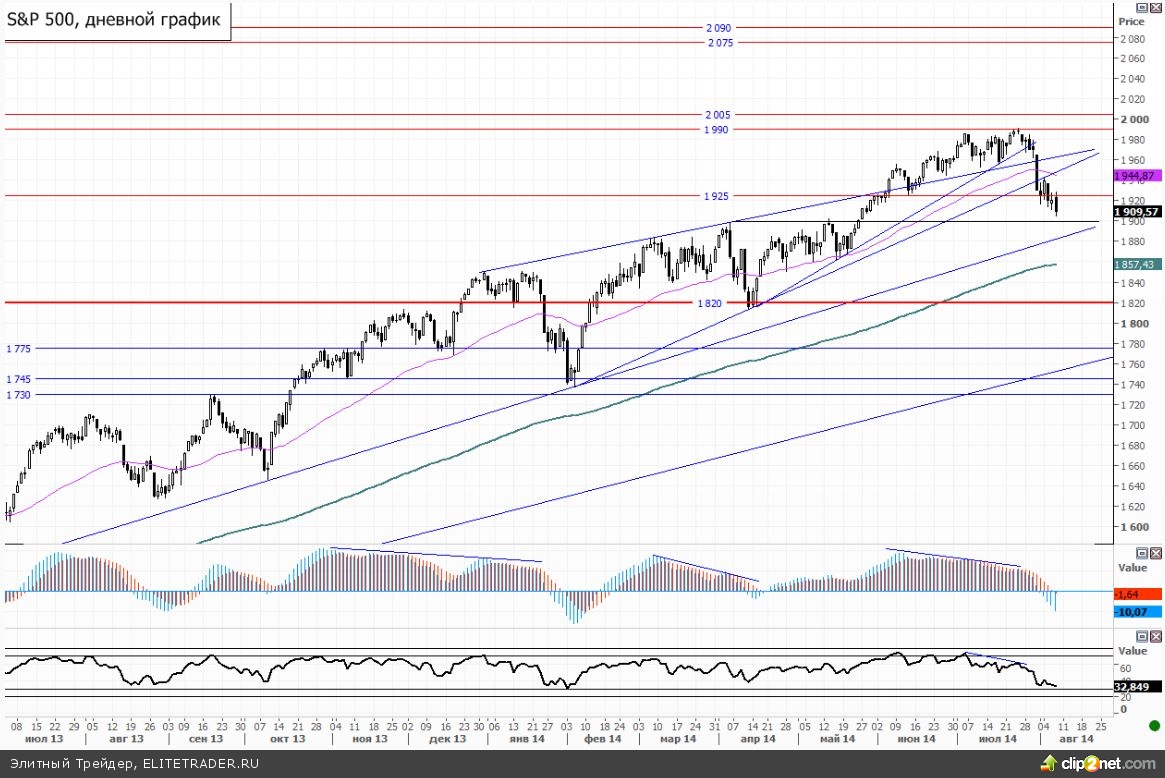 Сегодня утром фьючерс на SnP 500 впервые с мая опустился ниже 1900, как раз на новостях от Обамы, касающихся авиаоперации в Ираке. Общее положение дел на американском рынке акций сейчас очень напряженное. В предыдущих обзорах мы уже отмечали, что ситуация очень похоже на разворотную, и пока это предположение лишь подтверждается.