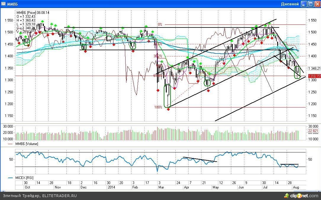 По итогам торгов пятницы российские индексы ММВБ и РТС прибавили в весе 1,4% и 1,09% соответственно. С учетом того, что в четверг на графиках этих инструментов мы увидели выкупную свечу типо «бычий молот» или «длинноногий додж», пятничный рост лишь подтвердил мое предположение о том, что наши биржи созрели для коррекционного движения наверх.