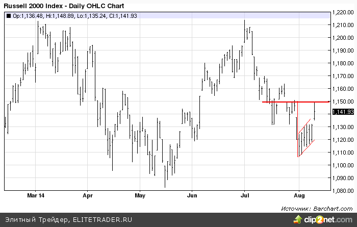 В то же время Nasdaq Composite, который объединяет тысячи акций торгующихся на площадке, вчера вырос на 0,7%. Еще более сильный рост показали индексы компаний малой капитализации. Russell 2000 вырос на 0,94%, и технически здесь медведям не позволили вывести индекс на реализацию фигуры продолжения нисходящей тенденции «медвежий флаг». Тем не менее, говорить о дальнейшем восстановлении стоит не ранее подъема выше сопротивления 1150 пунктов.