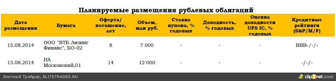 На рынке локального долга преобладают покупатели. Активность игроков, тем не менее, снизилась – оборот торгов во всех сегментах локального рынка облигаций составил во вторник всего 6,5 млрд руб. На фоне ослабления геополитической напряженности сохраняется спрос на госбумаги. Вчера индекс гособлигаций подрос на 0,32% до 123,3 п. Таким образом, за два последние дня ОФЗ отыграли падение прошлой недели. Доходности эталонных выпусков продолжают снижаться: доходность ОФЗ-26206 сократилась на 18 б. п. до 9,31%, доходность ОФЗ-26207 уменьшилась на 9 б. п. до 9,50% годовых. Минфин РФ, несмотря на существенное снижение доходностей госбумаг в последние дни, в четвертый раз подряд отменил аукцион по размещению облигаций федерального займа, запланированный на 13 августа, в связи с неблагоприятной рыночной конъюнктурой. В сегменте муниципального долга преобладали продажи – снижение индекса составило 0,5% до 93,8 п. Индекс корпоративных облигаций после снижения накануне во вторник закрылся ростом на 0,12% до 89,9 п. «ЮниКредит Банк» полностью разместил биржевые облигации серии БО-22 номинальным объемом 10 млрд руб. с переподпиской в 1,2 раза. Помимо ситуации на Украине, сегодня настроения на рынке будут зависеть от данных по недельной инфляции в России.