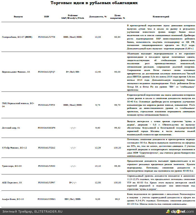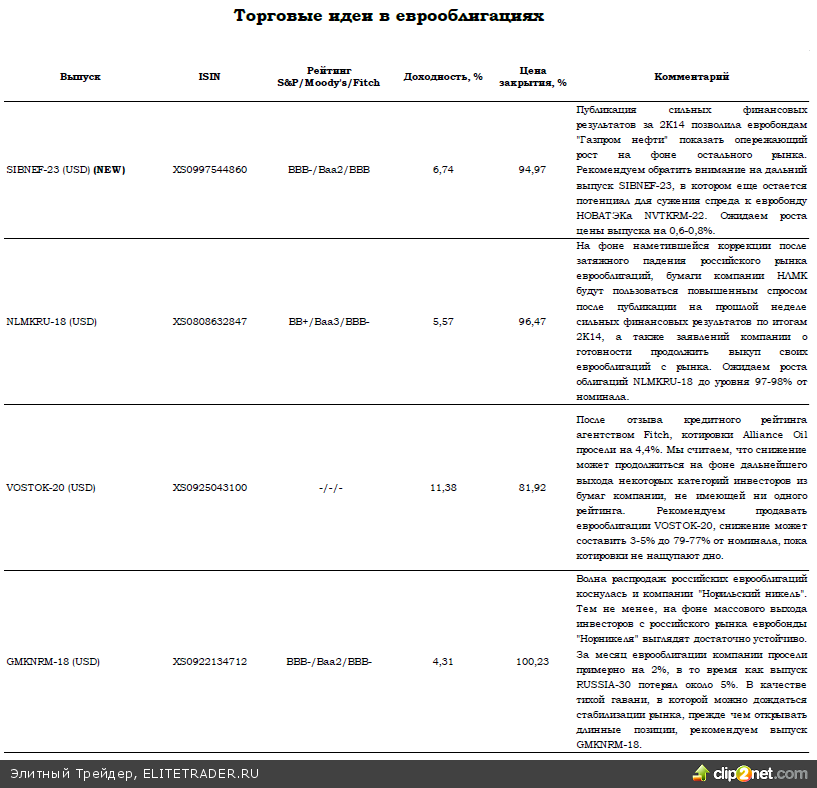 «Газпром нефть» вчера опубликовала консолидированные данные финансовой отчетности, подготовленные в соответствии МСФО, за I полугодие 2014 года. Чистая прибыль, относящаяся к акционерам ОАО «Газпром нефть», за отчетный период выросла на 12,9% и составила 87,60 млрд руб. Операционный денежный поток в I полугодии 2014 года достиг 145,56 млрд руб., увеличившись на 15,6% по сравнению с аналогичным периодом прошлого года. В части показателей, характеризующих кредитный профиль «Газпром нефти», отчетность умеренно- позитивная, как в сравнении с показателями прошлого года, так и в поквартальной динамике. Рост объемов продаж и благоприятная ценовая конъюнктура на рынке нефти и нефтепродуктов позволили компании существенно нарастить показатели продаж и EBITDA, которые в 1П14 по сравнению с 1П13 выросли на 13,9% до 814,9 млрд руб. и на 16,2% до 162,7 млрд руб. соответственно. В качестве плюса мы также отмечаем сохранение позитивной динамики операционного денежного потока, который за 2К14 вырос на 5,1%. Объем денежных средств на балансе возрос на 40%, однако из-за увеличения объемов долгосрочных кредитов и займов (+20%) и сокращения краткосрочных депозитов (-40%) чистый долг Группы в итоге вырос в отчетном периоде на 60% до 216,6 млрд руб. Значение метрики Чистый долг/EBITDA выросло с 0,56х на конец 1К14 до 0,64х на конец 2К14. На локальном долговом рынке «Газпром нефть» представлена 6 выпусками классических облигаций с преимущественно длинной дюрацией и невысокой ликвидностью. Мы считаем, что опубликованная отчетность будет нейтрально воспринята рынком. Более ликвидные выпуски Газпром нефть, 11 (дюрация 0,48 г, YTP – 9,45%) и Газпром нефть, 08 (дюрация 1,42 г, YTP – 9,82%) не предполагают существенного потенциала роста котировок.