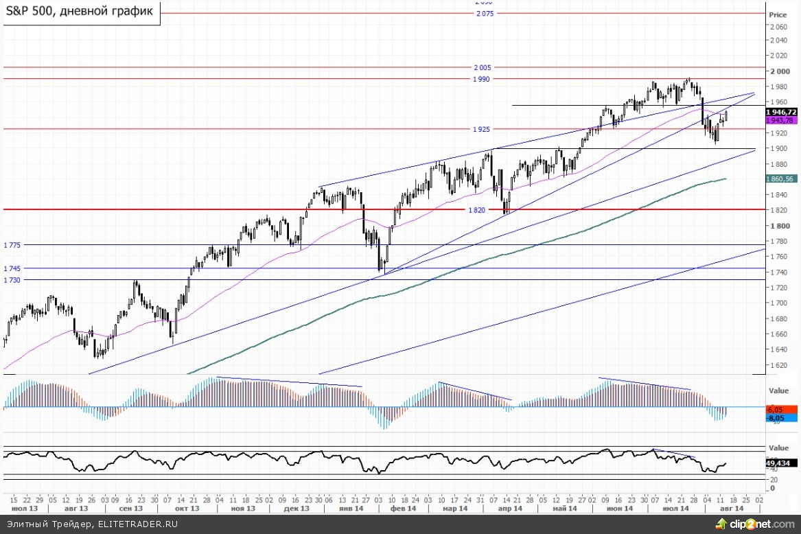 В данный момент сентябрьский фьючерсный контракт на SnP 500 торгуется с повышением на 0,03%, около отметки 1945.