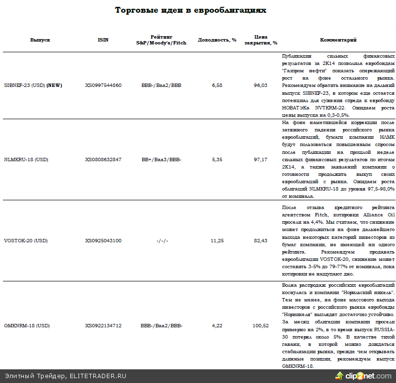 Вчера агентство Fitch подтвердило долгосрочные рейтинги дефолта эмитента в иностранной и национальной валюте «Россельхозбанка» на уровне «BBB-». Прогноз рейтингов – «негативный». Рейтинги РСХБ могут быть понижены либо прогноз по ним может быть изменен на «стабильный» в случае аналогичных действий по рейтингам Российской Федерации. На 1 июля 2014 года нетто-активы банка составили 1 883,10 млрд руб., что соответствует 6-му месту в банковской системе России. В конце июля банк попал в санкционные списки как Евросоюза, так и США, в связи с чем не может получать финансирование в любом виде сроком свыше 90 дней от американских кредиторов, а также привлекать капитал с европейского рынка свыше 90 дней через выпуск акций и облигаций. Тем не менее, новость позитивна для РСХБ, так как инвестиционный уровень рейтинга сохранен. Этим рейтинговым действием Fitch подтверждает мнение, высказанное ранее всеми тремя ведущими агентствами, о том, что введенные секторальные санкции не скажутся на кредитных профилях попавших под него банков. Подтверждение рейтингов РСХБ отражает оценку Fitch высокой вероятности получения банком поддержки от российских властей в случае необходимости. Государство уже предприняло ряд шагов, направленных на укрепление капитала банка. Несколько дней назад в рамках реализации схемы конвертации субординированных кредитов ВЭБа, выданных 6 лет назад, было принято решение о размещении в пользу РФ в лице Минфина привилегированных акций банка общей стоимостью 25 млрд руб. В результате уставный капитал РСХБ увеличится до 243,048 млрд руб. Агентство сохранило «негативный» прогноз для рейтинга банка, так как он соответствует аналогичному прогнозу суверенных рейтингов России. РСХБ широко представлен на рынке внутреннего долга. Среди бондов банка мы выделяем более ликвидный и короткий по дюрации выпуск РСХБ, БО-07 (дюрация – 0,84 г, G-спред-188 б. п.). Также мы сохраняем позитивный взгляд на облигации Газпромбанк, БО-07 (дюрация 0,7 г., G-спред- 177 б. п.) и Газпромбанк, БО-08 (дюрация 0,75 г., G-спред-169 б. п.) в расчете на сужение спреда к ОФЗ.