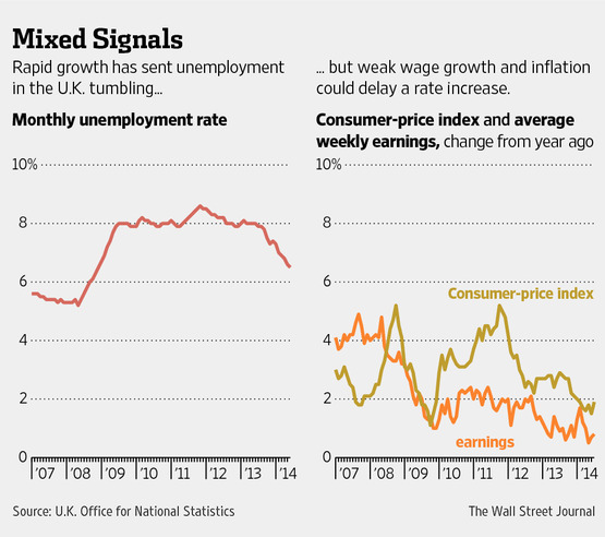 Инвесторы ожидают, что Банк Англии поднимет эталонные процентные ставки с исторического минимума в 0.5% в первом квартале 2015 года. Чиновники Банка Англии сигнализировали в среду о том, что слабый рост зарплат может привести к откладыванию первого повышения ставок.