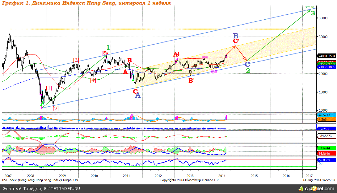 С конца 2008 года Индекс Hang Seng находится в пределах глобального умеренно восходящего коридора значений, который обозначен на графике 1 светло- синим цветом. В 2009-2010 годах был сформирован импульс роста, после чего последовала коррекция, которая развивается и в настоящий момент. Предполагаемую структуру динамики индекса мы отобразили на графике, приведенном выше. После завершения коррекции мы ожидаем развитие нового импульса роста, целью которого видим уровень 37250 пунктов. Индикаторы: MACD на недельном графике в настоящее время сформировал сигнал вверх. Индикатор повышения DMI+ находится выше индикатора понижения DMI-; индикатор силы тренда ADX расположен в нижней части шкалы и направлен немного вверх, что указывает на наличие восходящего тренда. Индикатор, основанный на динамике ADX, в настоящее время находится в процессе формирования сигнала к снижению. Осциллятор RSI коснулся зоны перепроданности, дав неуверенный сигнал вниз. Рекомендуем: 1) в рамках завершения подволны ((c)) — покупку фьючерсного контракта на Индекс Hang Seng по достижении индексом уровня 24800 пунктов с целью продать на уровне 27300 пунктов (+10,08%), стоп- приказ на отметке 24189 пунктов (-2,46%), временная перспектива — 1,5 месяца. 2) в рамках завершения волны (3) — покупку фьючерсного контракта на Индекс Hang Seng по достижении индексом уровня 23400 пунктов с целью продать на уровне 37250 пунктов (+59,19%), стоп- приказ на отметке 22260 пунктов (-3,42%), временная перспектива — 20 месяцев от момента открытия позиции. Поддержка: 24190; 22950; 22550; 22400; 21700. Сопротивление: 24965; 27300; 30000; 31960; 37250.