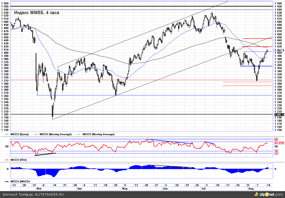 В то же время стоит понимать, что индекс ММВБ подбирается к серьезному сопротивлению в районе 1420. Пробить данную отметку в сложившейся ситуации будет не так то просто. Сейчас индекс уже изрядно перекуплен, так что спекулятивная фиксация длинных позиций с целью последующего их восстановления на более низких отметках вполне логична. Речь идет о всем рынке в целом, а не об отдельных корпоративных историях. К примеру, из Магнита и префов Транснефти можно уже выходить, а вот акции МТС, Северстали и Сургутнефтегаза-ап, как мне кажется, можно держать на среднесрочную перспективу и что называется «не дергаться» по лишнему поводу.