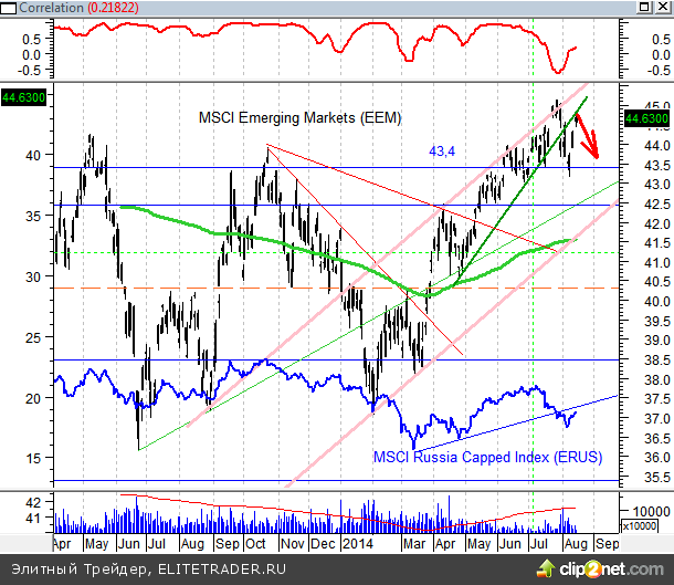 В такой ситуации радует то, что инвесторы в этом году провернулись лицом к развивающимся рынкам. С точки зрения технического анализа, индекс развивающихся рынков MSCI Emerging Markets (EEM) (+0,16%) выглядит сильно. Аналитики крупнейшего инвестиционного фонд мира BlackRock Inc, считают что стабилизация экономики Китая и дешевые цены на акции в Восточной Азии (особенно хвалят Южную Корею) создали благоприятный момент для покупки акций развивающихся стран. Россию по понятным причинам аналитики не хвалят, но нам это и не нужно. Сейчас российский рынок из-за геополитической напряженности стоит в стороне от общемировых тенденций. "Русский мужик медленно запрягает, но быстро едет" – мы отыграем позитив с развивающихся рынков позже. Президент России Владимир Путин вчера способствовал снятию напряженности, когда заявил, что Россия сделает всё от неё зависящее, чтобы конфликт на юго-востоке Украины прекратился как можно быстрее. Но поскольку мы находимся в суровых реалиях информационной войны, есть силы не заинтересованные в том, чтобы Россия примеряла на себе лавры миротворца. Отсюда проистекают все злоключения с колонной гуманитарной помощи из РФ. До выборов в Верховную Раду Украины спокойной жизни не будет. Глава Украины Петр Порошенко может объявить досрочные выборы в Верховную Раду 27 августа. Партии Порошенко, Ляшко и "Батькивщина" будут пытаться нарастить рейтинги на полях сражений в Новоросии.