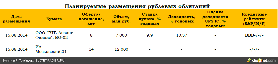 Х5 Retail Group отчиталась по МСФО за I полугодие 2014 года. Выручка ритейлера за отчетный период выросла на 15,3% до 299,746 млрд руб. Валовая прибыль составила 72,756 млрд руб, увеличившись на 16,5 % по сравнению с аналогичным периодом 2013 года. Показатель EBITDA компании вырос на 18,7 % до 21,194 млрд руб., чистая прибыль – на 49,8% до 6,449 млрд руб. В части кредитного профиля отчетность сильная. EBITDA margin в I полугодии 2014 года достигла 7,1% против 6,9% годом ранее. Более низкая по сравнению с II кварталом рентабельность в 7,3% стала результатом более слабого I квартала 2014 года. Общий долг X5 изменился незначительно и по состоянию на 30 июня 2014 года составил 110,4 млрд руб. вместо 110,5 млрд руб. на начало года. Структура долга комфортная и изменяется в сторону повышения доли долгосрочных заимствований. По состоянию на 30 июня 2014 года на долгосрочные обязательства приходилось 81,2% общего долга или 89,6 млрд руб., на краткосрочные – 18,8 % или 20,7 млрд. руб. Долговая нагрузка в терминах Чистый долг/EBITDA снизилась до 2,5х на конец отчетного периода против 2,7х на начало года и 2,8х на конец I квартала текущего года. В локальных бумагах Х5 Retail Group мы отдаем предпочтение более ликвидному выпуску Икс5 Финанс, БО- 01 (дюрация 1,1 г., YTM – 10,20%, G-спред 153 б. п.), премия по доходности которого к выпуску Магнит, БО-07 (дюрация 1,0 г., YTM – 9,60%, G-спред 98 б. п.), на наш взгляд, выглядит завышенной. По нашим оценкам, она должна ограничиваться 30-40 б. п. (Более подробно в нашем Специальном комментарии). Служба кредитных рейтингов Standard & Poor's в четверг присвоила ОАО «Группа компаний ПИК» долгосрочные рейтинги по обязательствам в национальной и иностранной валюте «B». Прогноз изменения рейтингов – «позитивный». «ПИК» возглавляет тройку крупнейших девелоперов в жилищном секторе и его деятельность сфокусирована на Москве и Московской области (80% проектов компании). Аналитики агентства считают, что у ПИК слабый бизнес профиль и высокие страновые риски ведения бизнеса вкупе с отраслевыми рисками, связанными в первую очередь с цикличностью и капиталоемкостью сектора строительства. В настоящее время облигаций компании в обращении нет, но компания готовится к возвращению на первичный рынок долга. Несколько дней назад Совет директоров Группы принял решение о размещении облигаций серий БО-01 – БО-07 общим объемом 29 млрд руб.