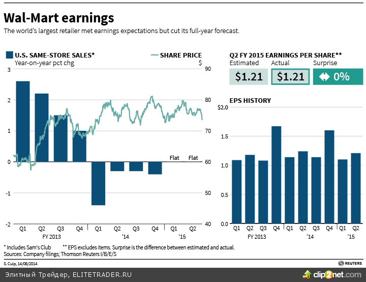 Вчерашний квартальный отчет крупнейшего ритейлера Wal-Mart не принес неожиданностей в плане прибыли и выручки, которые почти совпали с оценками Wall Street. В то же время компания сократила свой прогноз по годовой прибыли до $4,9-$5,15 на акцию с $5,10-$5,45, ссылаясь на более высокие расходы на социальные выплаты и увеличение инвестиций в онлайн-бизнес.