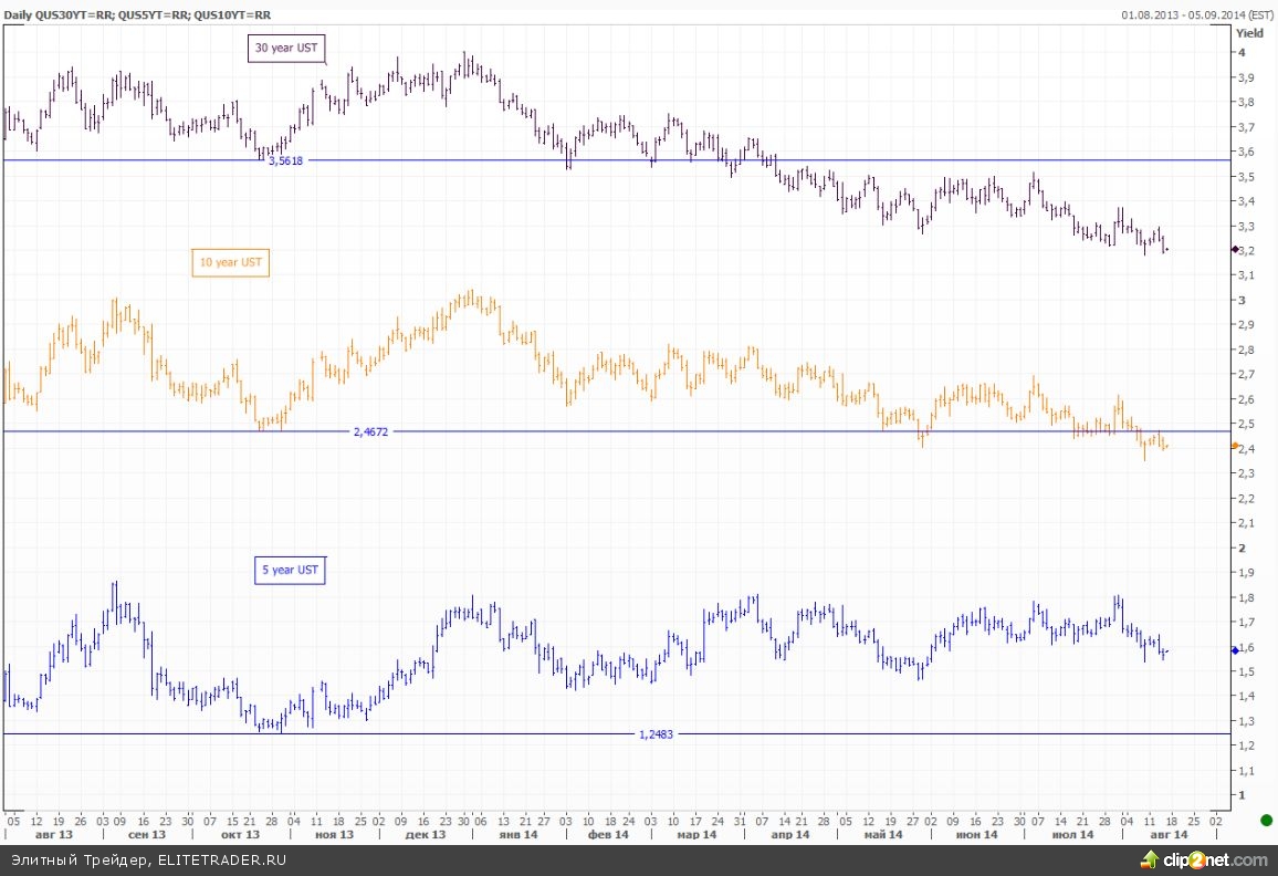 На этом фоне доходность американских казначейских облигаций пошла вниз и по 30-леткам едва не обновила многомесячные минимумы. Более того, прошедший вчера аукцион по долгосрочным бондам на сумму $16 миллиардов завершился при снижении доходности до 3,224% - самого низкого уровня за 15 месяцев.
