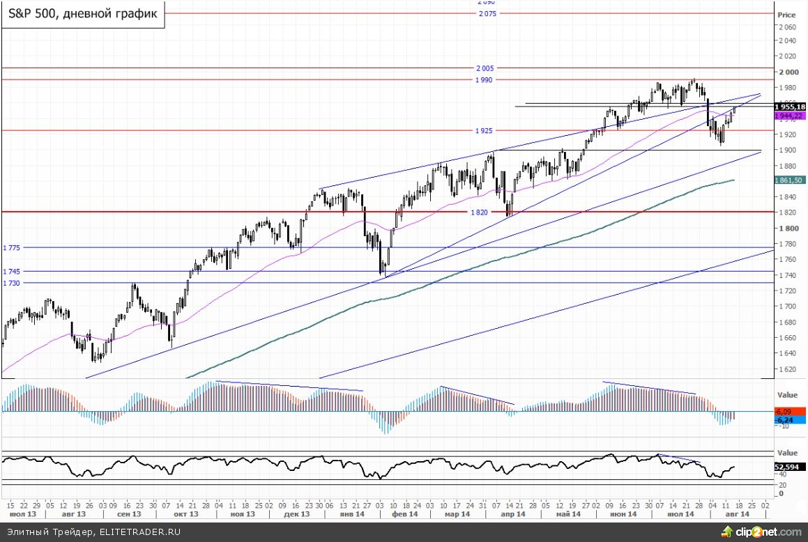 Как и предполагалось, индекс SnP500 продолжил развивать отскок от минимумов за 2,5 месяца и вчера достиг целевого уровня в районе 1955 пунктов, вновь протестировав снизу пробитый ранее восходящий тренд 2014 года. Здесь видится зона, в которой будет решаться вопрос о дальнейшем направлении движения. Пока речь идет о развитии коррекции в двухлетнем восходящем канале с целью на 1890-1900 пунктов.
