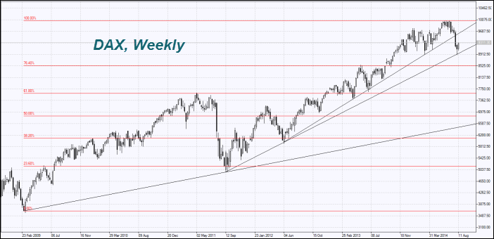 Европейские фондовые индексы сегодня растут третий день подряд. Если так будет продолжаться до конца дня, то они продемонстрируют максимальное недельное повышение за последние полгода. Инвесторы не обращают внимание на слабые показатели экономики ЕС. Они позитивно восприняли возможность нормализации политической ситуации на Украине после заявления президента РФ Владимира Путина. Мы полагаем, что в этом есть определённая логика: пока экономика не восстановится, ЕЦБ продолжит «накачивать» рынки ликвидностью. Показатель Р/Е индекса MSCI Germany находится на минимальном уровне за последние 10 лет и равен 12. Это говорит о теоретической недооценке немецких акций. У индекса MSCI Europe показатель Р/Е равен 13,6 и у SnP 500 — 15. Сегодня в Еврозоне не будет существенных макроэкономических данных.