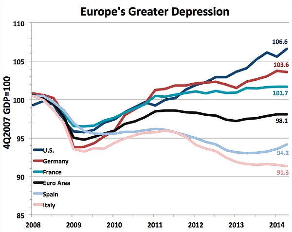 Последние данные, связанные с изменением уровня ВВП, только подтверждают эти печальные опасения. ВВП еврозоны в целом не продемонстрировал роста во втором квартале. Не растёт экономика Франции, уже на протяжении года. Экономика Германии показала спад на 0,2 процента по сравнению с предыдущим кварталом — и это после того, как страна относительно спокойно преодолела вторую волну рецессии в начале 2013 года. И всё же Германия находится в гораздо лучшем положении, чем Италия: там третья волна кризиса смела экономический рост, отбросив экономику до уровня 2000 года. Относительно хорошие новости приходят из Испании — там после падения наблюдается временный «отскок вверх» — рост составил 0,6 процентов. Но безработица в Испании сохраняется на очень высоком уровне — 24,5 процента.