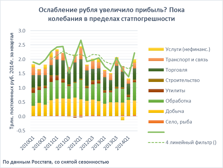 Соответственно, поскольку сколько-нибудь выходящего за пределы статпогрешности снижения реального ВВП страны пока нет, и уровень чистых налогов на продукты в целом остается без изменений, результатом должно стать увеличение доли и физъобъема валовой прибыли. А это может стать стимулом для увеличения деловой активности и дать дополнительные ресурсы для инвестиций (хотя с равным успехом может быть привести и к усилению оттока капитала; в 1999 и последующих годах наблюдались оба эффекта). Пока что Росстат поделился данными о прибыли за полугодие корпоративного нефинансового сектора (без учета доходов малого бизнеса, где издержки по оплате труда и валовая прибыль обычно неразличимы), и эти данные вроде как подтверждают предположение о позитивном воздействии на нее (прибыль) происходящих изменений.