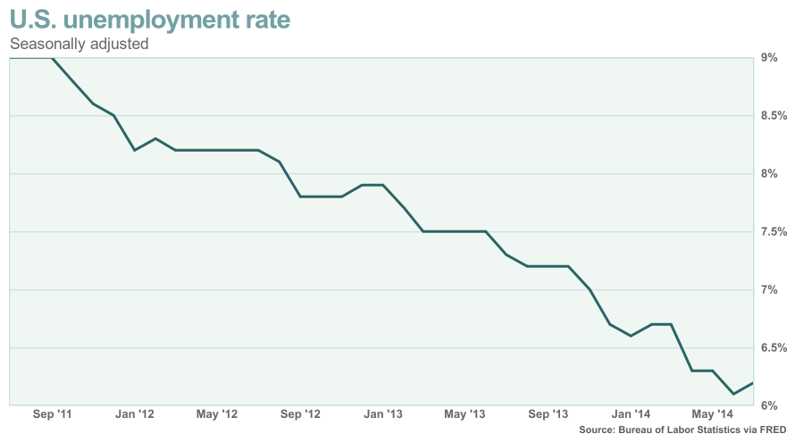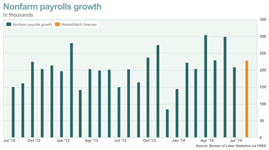 Уровень безработицы подрос в июле до 6.2% впервые с февраля. Начало нового тренда? Сомнительно. Экономисты, опрошенные MarketWatch, прогнозируют, что уровень упадет обратно до 6.1% вновь и продолжит падать в следующем месяце. Уровень безработицы существенно падал за последние несколько лет, во многом благодаря людям, которые выходили из состава рабочего актива страны. Сейчас экономисты считают, что более быстрое создание рабочих мест - это движущая сила. Рост найма пока так и не вызвал существенного роста средней почасовой оплаты, хотя в 2014 году наблюдался более существенный сдвиг в сторону более высокооплачиваемых рабочих мест по сравнению с прошлым годом. Экономика не сможет расти быстрее, пока люди не начнут зарабатывать и тратить больше.