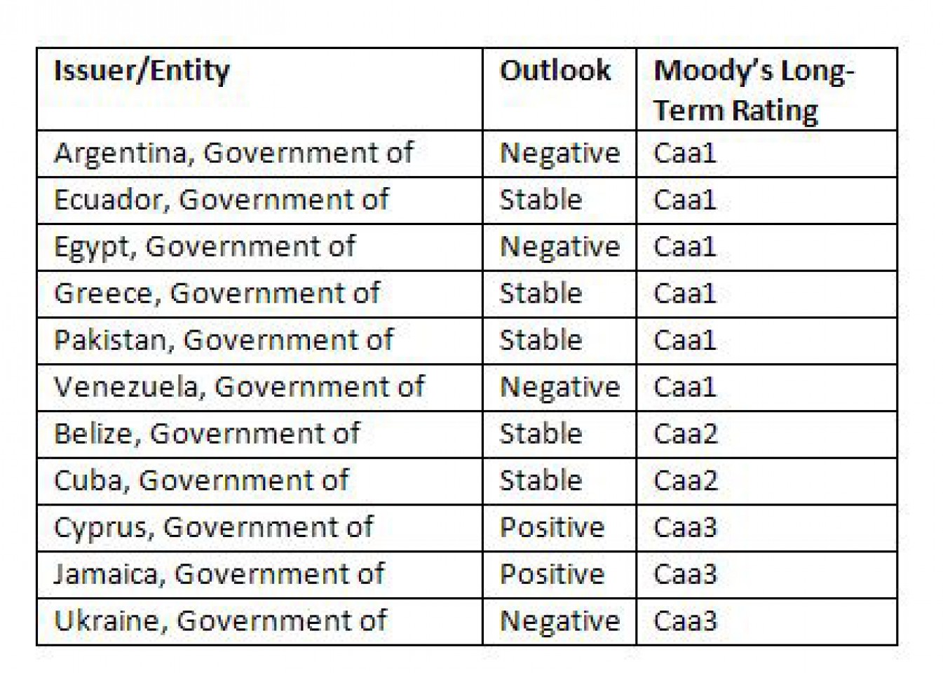 Иными словами, агентство рассматривает аргентинский долг как крайне рискованный объект инвестиций. Ну а теперь пришло время рассмотреть, какие еще страны имеют схожий рейтинг по шкале Moody's. Отметим, что рейтинги "Caa2" и "Caa3" являются еще более спекулятивными, чем "Caa1".