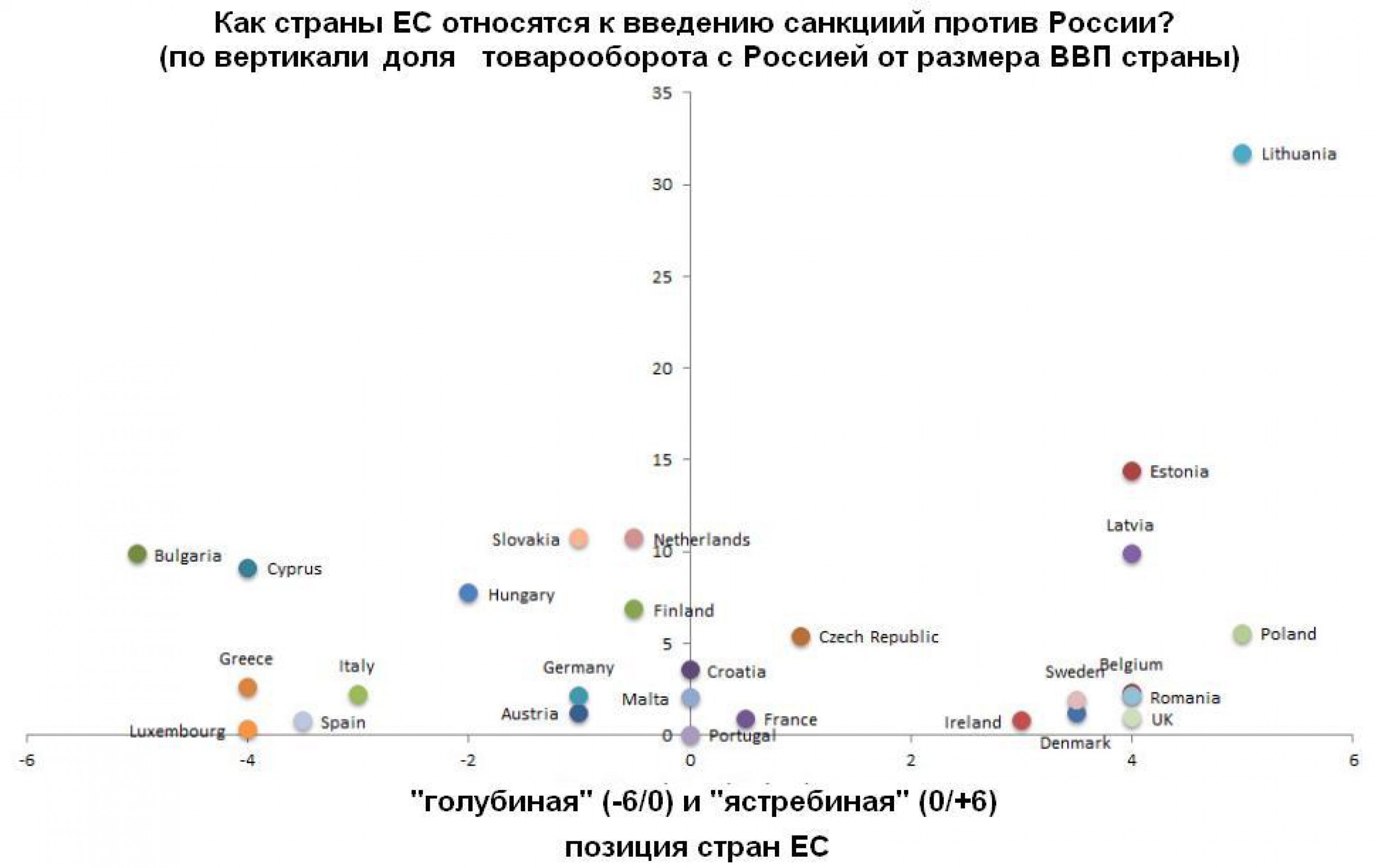 Многие страны, особенно в Восточной Европе, имеют тесные экономические связи с Россией, но все же остаются достаточно "воинственными" в вопросе введения санкций, что, вероятно, обусловлено историческим опытом.