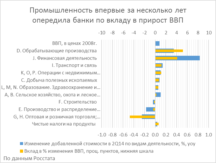 1. В опубликованной в понедельник Росстатом первой оценке производства ВВП за половину года по видам экономической деятельности – небольшая сенсация. Впервые за несколько последних лет наибольший вклад в прирост ВВП во 2-ом квартале (0.8% в годовом сопоставлении) дала обрабатывающая промышленность, определив стабильного лидера последних лет – услуги финансового посредничества (т.е. банки и прочие финансовые фирмы). Правда, высокие по нынешним временам цифры прироста добавленной стоимости обрабатывающих производств в годовом сопоставлении (3.5% в 2-ом квартале и 3.0% за полгода в целом) - в значительной степени результат эффекта базы: спада 1-ой половины прошлого года. В тоже время рост финансового сектора во втором квартале взял паузу после валютного кризиса начала года.