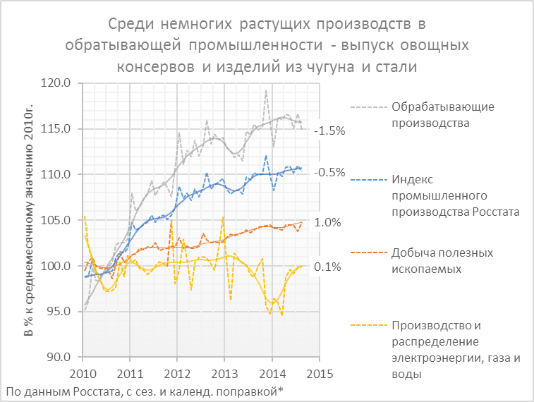 Бурный рост в обрабатывающей промышленности показывает лишь чёрная металлургия – выплавка чугуна выросла за год на 3.1%, стали – на 5.3%, производство проката – на 7.9%, а труб - на 15%, причем выпуск во всех перечисленных производствах (кроме трубного) вырос в августе также и по отношению к июлю. Надо понимать – это результат частичного уничтожения соответствующей отрасли украинской промышленности, которое заодно решило и задачу поддержки отечественного производителя. (Это как бы ополченцы в России, если они паче чаяния снова тут появятся, самопровозгласили не мало на что влияющую в экономическом плане Ичкерию, а какую-нибудь Лангепас-Урай-Когалымскую Нефтенародную Республику, что дало бы мощный импульс развитию нефтедобычи в разных странах.) Кроме того, рост выпуска в годовом сопоставлении сохранили нефтепереработка, производство минеральных удобрений и красок, кирпича, цемента и большинства других строительных и отделочных материалов.