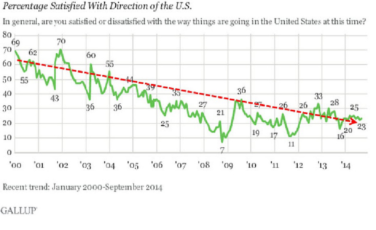 В долгосрочной перспективе удовлетворение американцев текущим курсом страны относительно стабильно за последние несколько лет – с 2010 г., несмотря на краткосрочные перемены, такие как выборы 2012 г. Уровень был немного выше в 2009 г., сразу после того как Барак Обама был избран президентом, а в 2008 г. он был значительно ниже во время финансового кризиса на фондовой бирже. И, конечно, за последнее десятилетие он был значительно выше, достигая 70% после террористической атаки 11 сентября 2009 г., когда американцы чувствовали прилив патриотизма.
