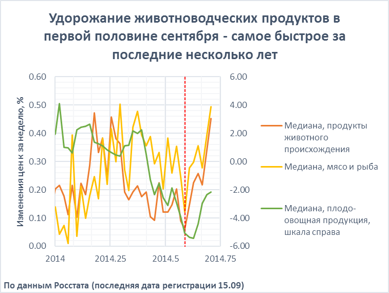 При сохранении динамики цен первых 2 недель до конца сентября рост общего индекса цен в годовом сопоставлении уже по итогам месяца составит 8-8.1% (актуальный прогноз ЦБ на год - 7.5%, установленная год назад цель по инфляции на текущий год – 5%, была повышена с 4.5% после внезапной отмены правительством своего решения о замораживании в 2014 жилищно-коммунальных тарифов для населения).
