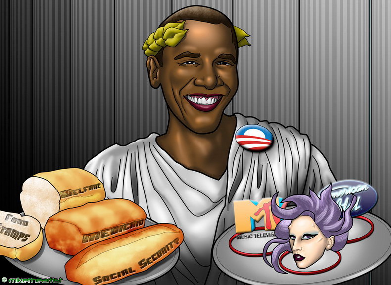 Закат Римской империи растянулся на века. Народ постепенно утрачивал гражданские свободы и ценности, позволяя демагогам удерживать власть, что в конце концов привело к захвату и раздроблению одряхлевшей империи ордами варваров. В то время как плебеи довольствовались дармовыми развлечениями, власть имущие безудержно обогащались за счет опустошения казны и вели безумно роскошную жизнь. Лидеры приобретали одобрение и поддержку народа не беззаветным служением, а обманом, подкупом и потаканием сиюминутным желаниям и низменным инстинктам толпы. Бесплатный хлеб, цирковые представления и массовое истребление христиан, которых попросту отдавали на растерзание львам, отвлекали простонародье от мародерства политиков и разбазаривания национального богатства империи.