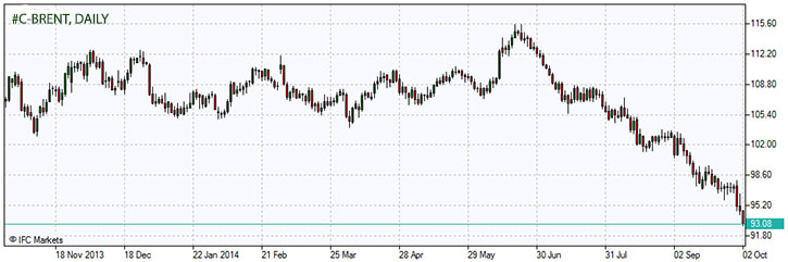 Цена на нефть вчера упала, после того, как Саудовская Аравия снизила ноябрьские отпускные цены на нефть. Цена ноябрьского фьючерса на нефть сорта Brent упала на 51 цент, или на 0,5%, и на закрытие сессии составила $94,16 за баррель на лондонской бирже ICE Futures Europe. Цена закрылась на самом низком уровне с 28 июня 2012 года. Объем торгов всех фьючерсов был на 19% выше среднего за 100 дней, в Нью-Йорке в 15:24 по местному времени. Цены рухнули на 16% в прошлом квартале и на 15% в этом году. Нефтяная компания Саудовской Аравии Aramco снизила цену на легкую нефть в ноябре между -20 центов и -$1,20 за баррель. Снижение цены крупным производителем нефти на фоне ослабления мирового спроса можно считать знаком того, что сокращение производства не планируется, вместо этого целью этого является увеличение их доли на рынке.