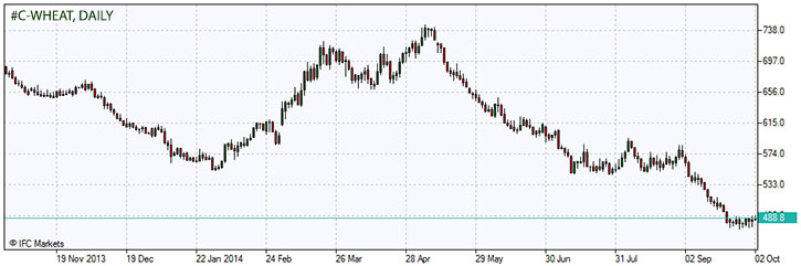 Котировки пшеницы растут второй день подряд из-за засухи в Австралии и сокращения экспорта из России. Это указывает на возможность сокращения поставок, на фоне ожидаемого рекордного уровня мирового производства. Декабрьский контракт на поставку вырос в цене на 0,9% до $4.835 за бушель на Чикагской торговой бирже. До этого цена закрылась на $4.8225 к 14:15 в Сингапуре по местному времени. Российский экспорт сократился после того, как цены внутреннего рынка выросли в связи с последствиями кризиса на Украине. Декабрьский фьючерс на кукурузу торгуется на отметке $3.215 за бушель, после вчерашнего закрытия цены на $3.2125. Ноябрьский контракт на сою вырос на 0,1% до $9.18 за бушель, после вчерашнего падения до отметки $9.04.