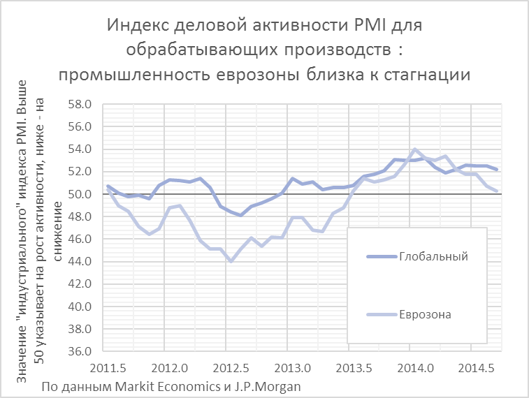 Россия и Европа. В то же время промышленность еврозоны, вкусную продукцию которой европейцам теперь приходится поедать самостоятельно, без нашего содействия, уверенно движется к стагнации. Спад распространился на Германию, Австрию и Грецию, присоединившиеся в сентябре в этом грустном деле к Франции с значениями PMI, указывающими на спад. Особенно прискорбно выглядит указывающий на промышленное сжатие PMI Германии (это он делает впервые с июня прошлого года), одной из причин чего в комментарии к индексу прямо называют кризис на Украине и введенные ЕС ограничения на экспорт (немцами) ряда видов оборудования в Россию.