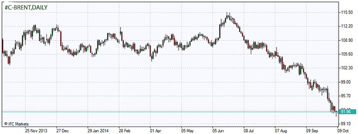 Цена на нефть продолжает падать на фоне экономического спада и увеличения производства основных производителей, включая США, Россию и ОПЕК. Ноябрьский фьючерс на нефть Брент на лондонской бирже ICE Futures упал на 73 цента, или 0,8%, и цена закрылась на $91,38 за баррель. По сообщениям Министерства энергетики США, запасы нефти выросли на 5 млн. баррелей на прошлой неделе. Этот показатель оказался выше ожидаемого увеличения на 2,1 млн. Производство нефти в США выросло до 8,88 млн баррелей в день на прошлой неделе. Медвежий импульс по нефти можно считать сильным. Эксперты предполагают смену тренда только в случае выхода соответствующих экономических данных.