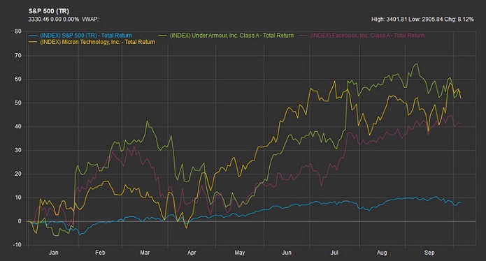 Динамика доходностей индекса SnP 500 и акций компаний Under Armour, Facebook и Micron Technology с начала года
