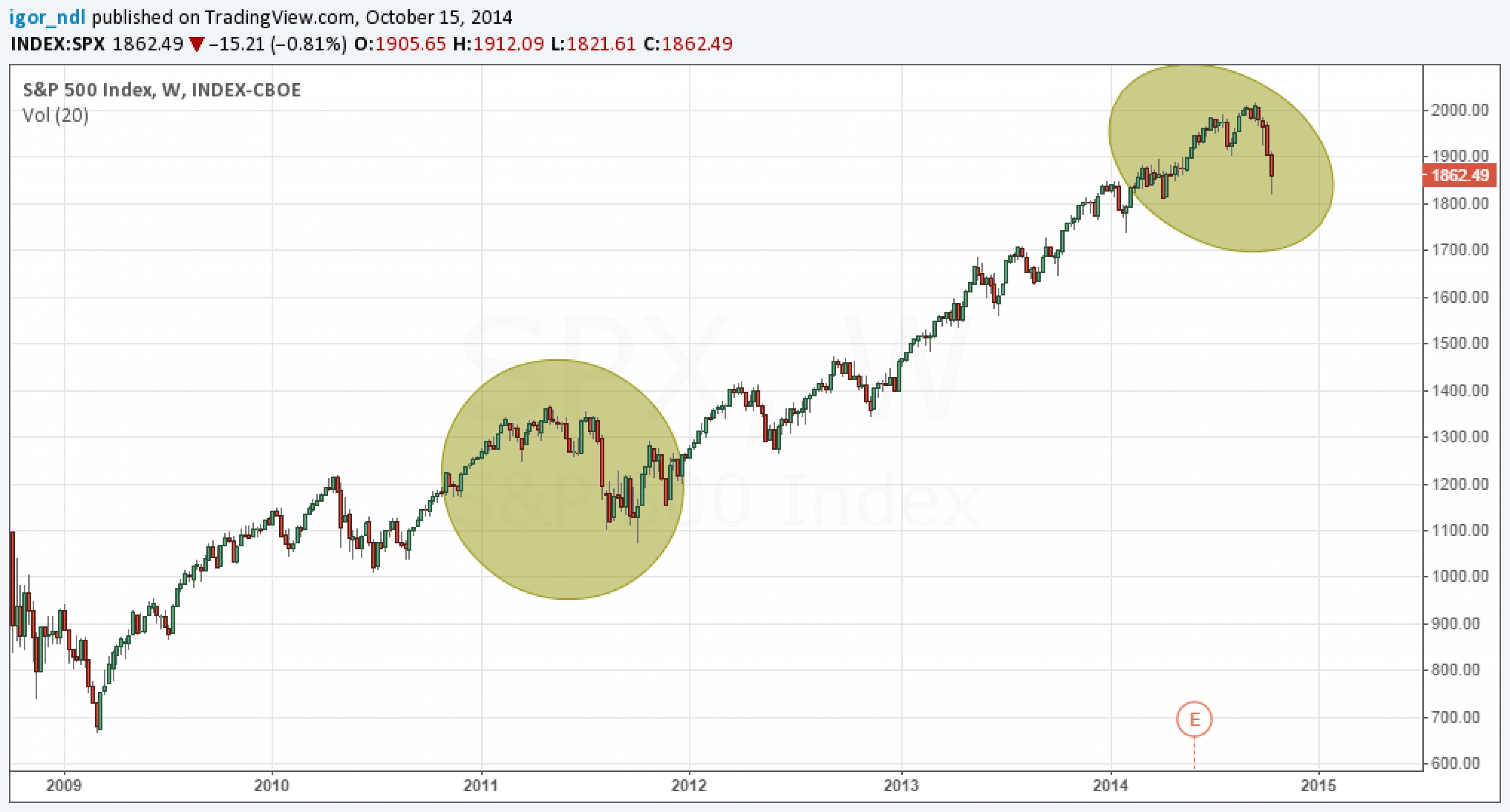 Похоже, что кто-то из крупных игроков застрял в длинных позициях или просто таким образом решили устроить разворот. Стоит отметить, что всего за пару часов индекс широкого рынка смог отыграть 40 пунктов, и это при том, что в последние годы для такого движения требовалось как минимум несколько дней. В принципе, рост волатильности по мере завершения стимулов был ожидаем, и мы об этом писали. Ситуация как две капли воды напоминает 2011 г., когда QE также завершилась.