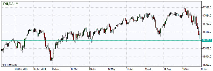 После выхода отчетов в среду, показавших, что потребители стали более предусмотрительными и сократили свои расходы, о чем указывает падение показателя розничных продаж, а цены американских производителей упали впервые более чем за год, инвесторы отреагировали продажей акций и покупкой менее рискованных казначейских облигаций. Во время торговой сессии индекс SnP 500 опустился вниз до минимального уровня начала года; его дневное снижение составило 9,8%, прежде чем он упал на 15,21 пункта, или на 0,8%, до 1,862.49. Индекс Dow Jones Industrial Average упал на целых 460 пунктов во время дневной сессии, но закрылся вниз на 16,141.74, опустившись на 173,45 пункта, или на 1,1%. Из доклада Министерства торговли США розничные продажи в сентябре, на которые приходится треть потребительских расходов, снизились на 0,3%, его первое снижение с января. Негативные данные по продажам и показателю инфляции говорят о сохраняющихся медленных темпах восстановления экономики и означает, что ФРС возможно сохранит ставку на нынешнем низком уровне до конца 2015 года в качестве меры поддержания экономики.