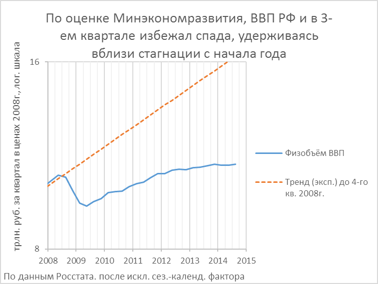 1. Вынесенная в заголовок цитата из комментария экономиста банка HSBC к представленному этим банком исследованию конъюнктуры в обрабатывающем секторе российской промышленности в октябре по программе PMI, строго говоря, характеризуют состояние именно этого сектора в начале последнего квартала 2014г. Но без большой натяжки её можно отнести и ко всей экономике с начала нынешнего года. Парой дней ранее Минэкономразвития опубликовало свою оценку ВВП страны в 3-ем квартале – рост на 0.7% в годовом сопоставлении. В переводе на поквартальную динамику с сезонной очисткой она означает, что объем совокупного выпуска на протяжении 9 мес. с начала года колебался с незначительным размахом возле локального пика, достигнутого в последнем квартале прошлого года, так ни разу и не превысив его.