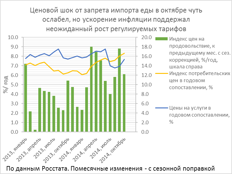 В целом «головная» инфляция выросла до 8.3% в годовом сопоставлении в октябре против 8.0%, что можно было бы считать неплохим результатам с учетом упомянутых выше шоков немонетарной природы, а также понемногу начавшегося уже переноса ослабления рубля на цены (благодаря запрету импорта еды, этот эффект действует более медленно и менее остро, чем было бы без него). Однако базовая инфляция, которую можно считать «оперативным» отражением денежно-кредитной политики, также ускорилась (в годовом сравнении), причем даже более сильно, чем «головная» - до 8.4% в годовом сравнении против привычных ранее 5.5-5.8%, сохранившихся еще и в первые месяцы текущего года. Даже по «более правильному» базовому индексу цен VTB Capital, полностью исключающему немонетарные шоки со стороны продовольствия (а не только регулируемых тарифов), видно ускорение инфляции до 5.8% в годовом сопоставлении (с 5.2-5.4% в летний период), при скорости изменения за месяц (SAAR), поднявшейся выше 7.0% против 5.0% летом.