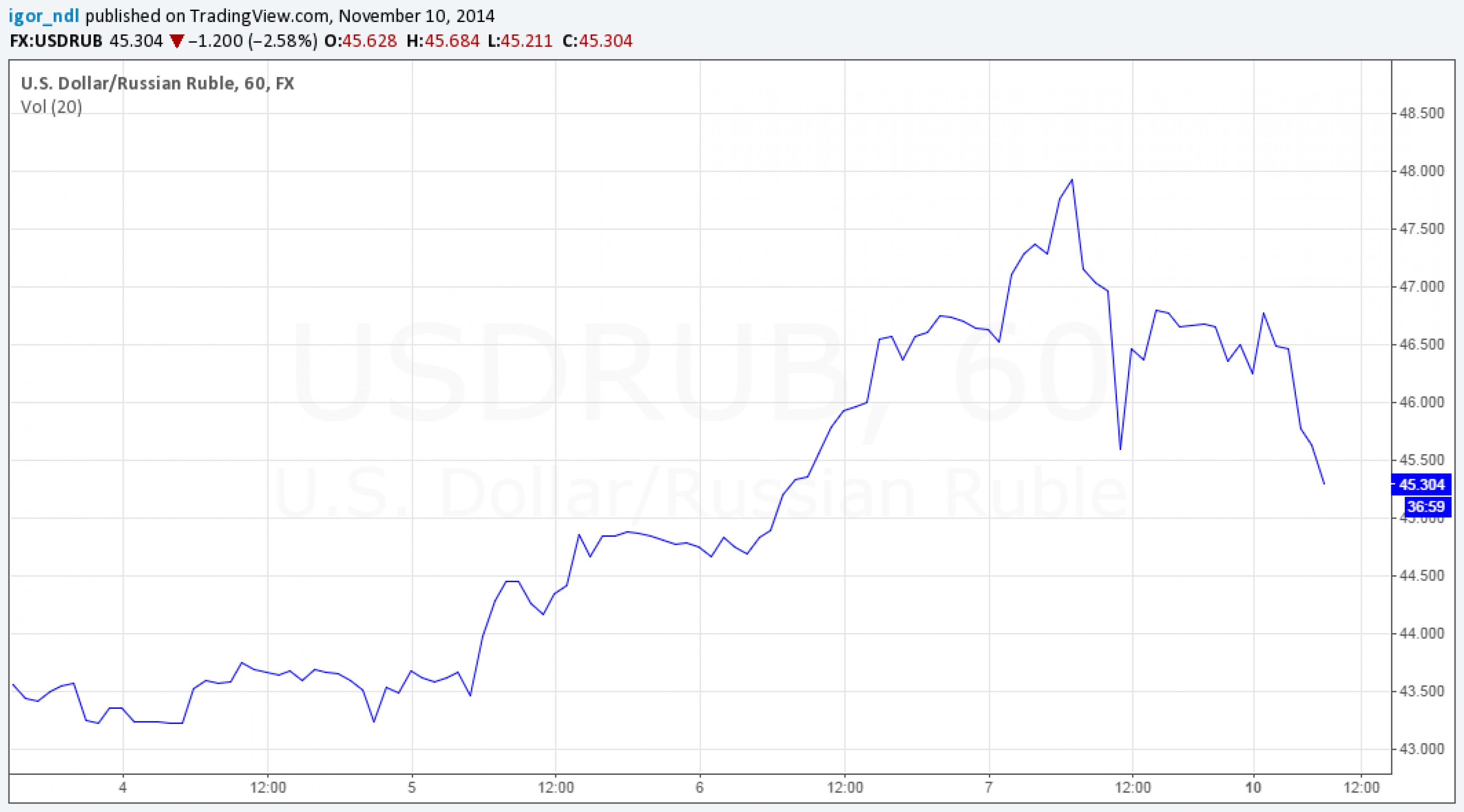 Точный ответ на этот вопрос дать, конечно же, пока сложно, но все предпосылки для определенной стабилизации есть. В понедельник, практически сразу после начала торгов, рубль укрепился и к евро, и к доллару. По состоянию на 12:20 по московскому времени курс доллара упал на 2,8% до 45,35 руб., а курс евро снизился на 2,5% до 56,50 руб.