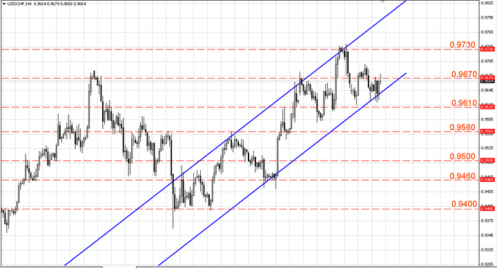 Пара торгуется в восходящем канале 0.9645-0.9730. Значимые уровни Фибоначчи для нисходящей коррекции 23.6 (0.9650), 38.2 (0.9600) и 50.0 (0.9550).